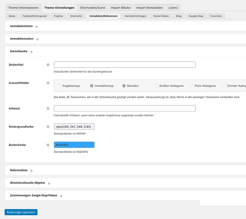 - optionale Schnellsuche im Header oder via Shortcode mit Freisuche und Auswahl nach (max. zwei) Kategorien: Angebotstyp, Immobilientyp, Standort, Größen-, Zimmer- oder Preis-Kategorie, Schlagworte